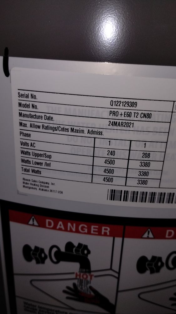 The Rheem 63Gallon 240/4500 8/8 WAR PROE60T2CN80 is a high-efficiency water heater designed for reliable, energy-efficient performance. With a capacity of 63 Gallons for larger household needs, it meets various household needs, from moderate to high-demand usage. This electric water heater features 4500W power output for effective heating, ensuring effective heating with a compact, durable design. Backed by a manufacturer warranty, it’s ideal for homeowners seeking efficiency, reliability, and easy installation. Perfect for ensuring comfort and energy savings in residential spaces. Location: Alexandria, ON
