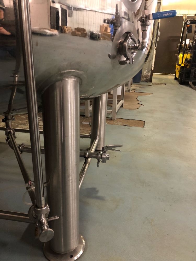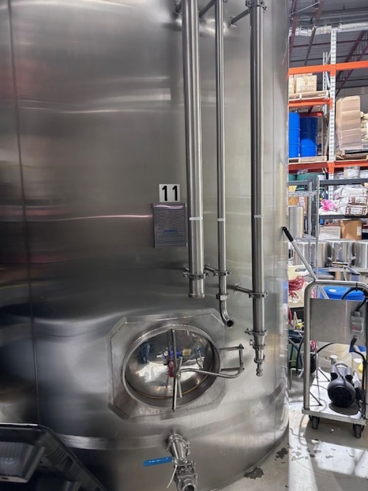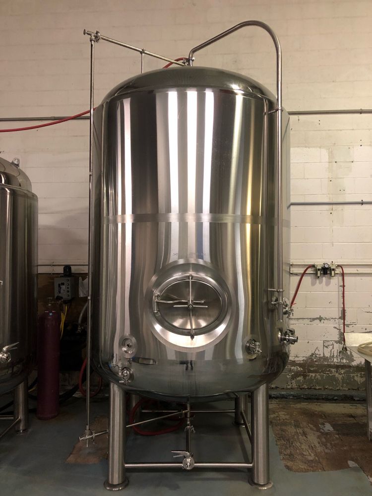 1680 Gallon (40 bbl) Brite Vertical Stainless Steel Tank Total Capacity: 44 bbl Dimensions: Total height: 3840 mm (12’ 7”) Internal Diameter: 1500 mm (4’ 11”) Outside Diameter: 1600 mm (5’ 3”) Technical Characteristics: Operating pressure: 14.9 psi maximum Stainless steel shell, 304/2B finish, 2 mm thick Domed top, 3 mm thick Dished bottom, 3 mm thick #2 – Dimpled glycol jacket, 26.6” H (600 mm), positioned on the side of vessel #1 – Dimpled glycol jacket, 47” H (1200 mm), positioned on the side of vessel High density insulation, 2” Stainless steel clad, 1.5 mm thick, on side of vessel (full welded) Stainless steel clad, 1.5 mm thick, on bottom of vessel (full welded) Stainless steel legs with adjustable floor pads Side manway, “shadowless” Dual scale thermometer with thermowell Thermowell for probe positioning Sampling valve, “Perlick” Racking outlet, 1.5" TRC Total discharge, 1.5" TRC Vacuum/pressure relief valve, 2" tri-clamp NPT fitting for glycol inlet/outlet CIP arm, 1.5", with removable spray ball assembly Sight gauge with CIP connection #1 – CO2 carbonating stone #2 – CO2 valve, ¼” complete with pressure gauge #2 – Lifting lugs 2-1.5” TC butterfly valves 2-1.5” TC clamps 2-1.5” TC gaskets Condition: Used-Like New Location: Nova Scotia, Canada