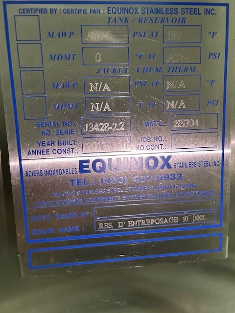 2640 Gallon (10000 L) Vertical 304 Stainless Steel Tank 7' D X 11' H Built: 2012 Atmospheric Pressure Non Jacketed Last Use: Grapefruit Oil Location: Montreal, QC