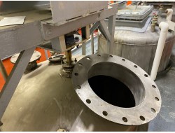970 gallon (3600L) approx, vertical, stainless steel jacketed (heating 3.25" thickness) processor tank 84"H X 56"OD top manhole with 15.5" opening. Side baffles inside with propeller near base. The Lightnin' agitator is 3HP, with a 14.3 ratio and output of 125 rpm. Serial# of the agitator is 7908164 and the model is 71-0-3. Previous use: liquid spice blend No water level switch or sensor Tank has no legs. It is currently supported in deck flooring. The inlet and outlet piping are both 2” There are 3 vent holes at top, which includes two 1” vent one 3” vent. Location: Greater Toronto Area