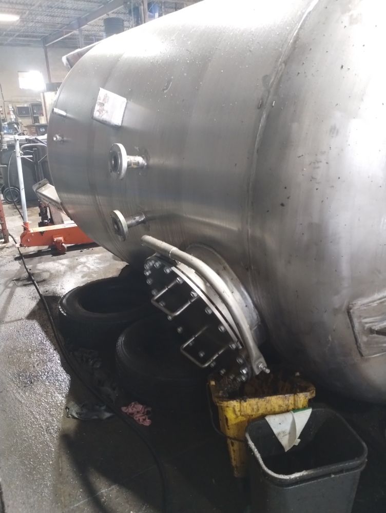 2900 Gal (11000L) Jacketed 304 Stainless Steel Vertical Tank Steam heating coil, Top Mixer HP, Dish bottom 76"D X 110"H (straight side) with 18" dish bottom and 3X 26" Legs 150PSI, 2" outlets, Manhole at side top, Bottom discharge Last use: Fish Oil Weight: 10,000 pounds approx Location: Montreal, QC