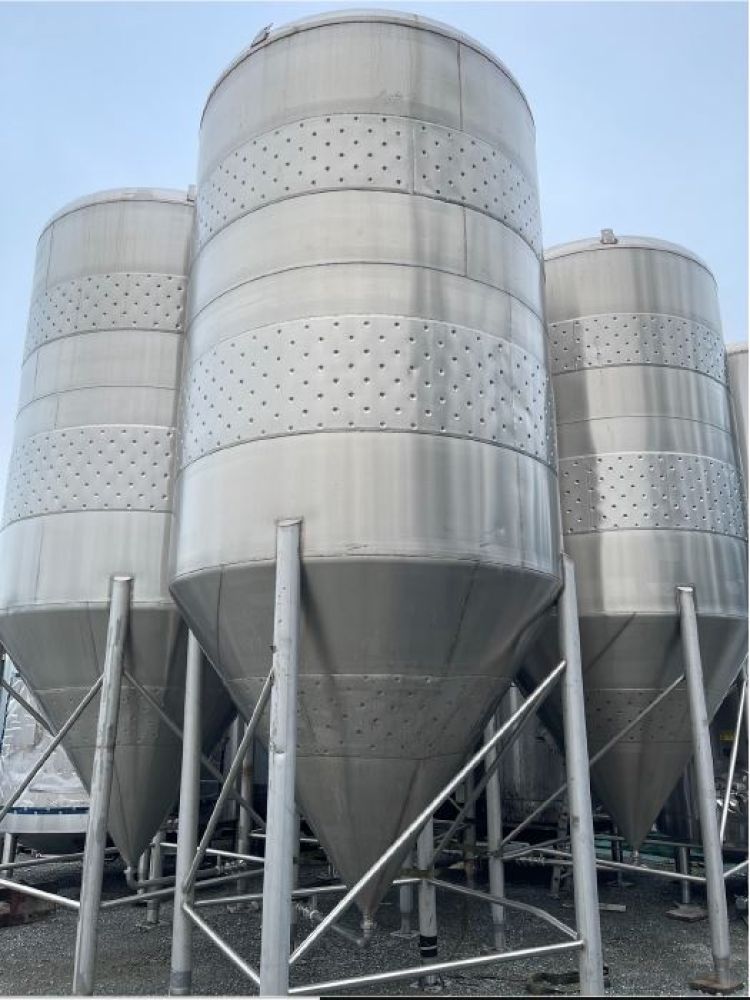 2X available Capacity: approx. 5,000 US gal each Construction: 304 stainless steel, insulated, smooth outer cladding Configuration: Vertical, leg-mounted Features: Large manways and CIP piping (as shown in photos) Approx. dimensions (each): ~7.25–7.5 ft diameter × ~19–20 ft tall Condition: Used; cosmetic wear consistent with age; structurally intact Location: Mill Bay, BC (Canada)
