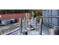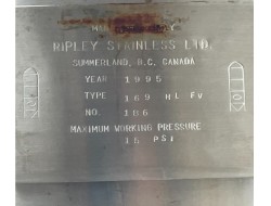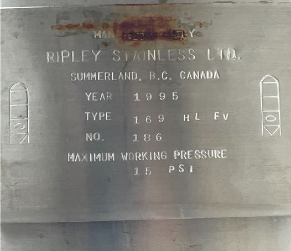 Capacity: 4,000 US gal (approx. 16,900 L / 169 HL) Manufacturer: Ripley Stainless Ltd. (Summerland, BC, Canada) Year: 1995 Material: 304 stainless steel Bottom: Cone-bottom (aggressive cone) Max working pressure: 15 PSI Serial No.: 186 Approx. dimensions: ~6.5 ft diameter × ~18–19 ft tall Approx. weight: ~16,500 lb Condition: Used; one localized dent in the shell (cosmetic only—no puncture/leaks). Mill Location: Mill Bay, BC (Canada)